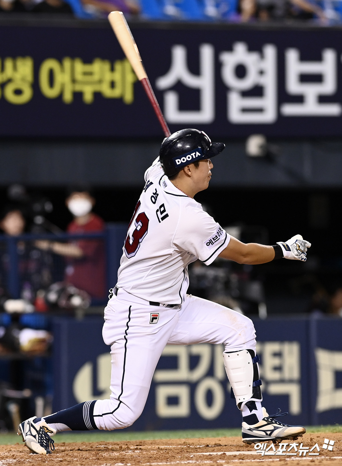 (엑스포츠뉴스 잠실, 고아라 기자) 24일 오후 서울 송파구 잠실야구장에서 열린 '2022 신한은행 SOL KBO리그' KT 위즈와 두산 베어스의 경기, 4회말 1사 1루 두산 허경민이 2루타를 날리고 있다.