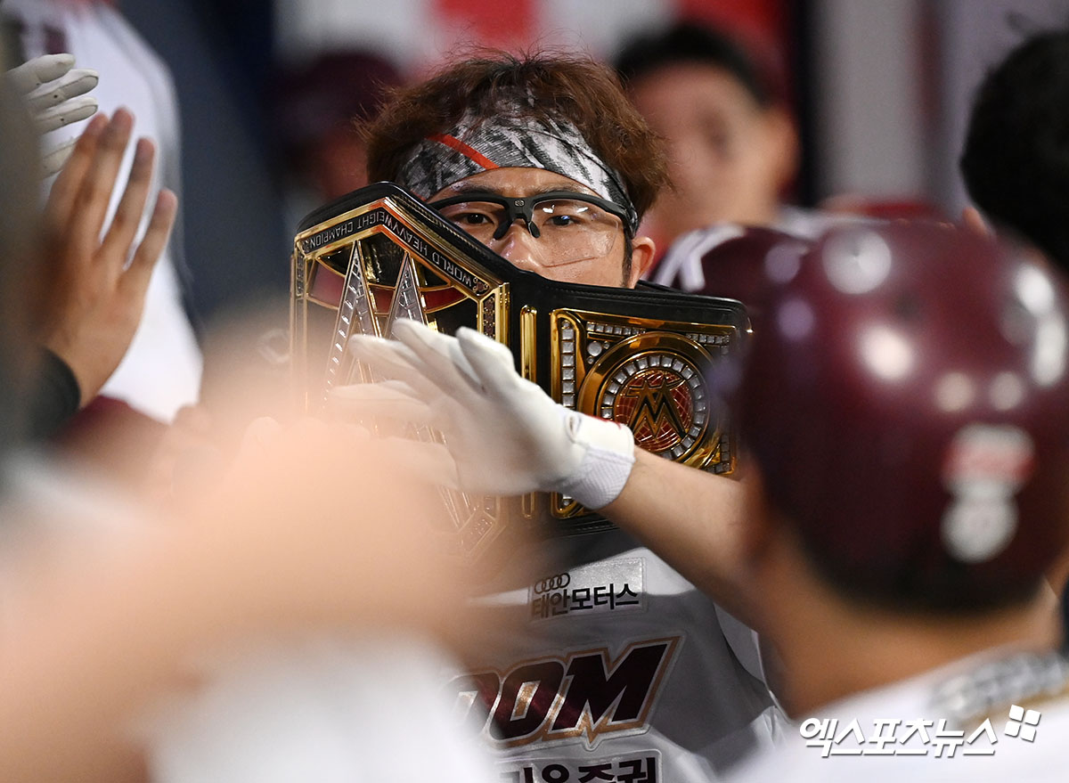 (엑스포츠뉴스 고척, 김한준 기자) 24일 오후 서울시 구로구 고척스카이돔에서 열린 ’2022 신한은행 SOL KBO리그’ KIA 타이거즈와 키움 히어로즈의 경기, 6회말 1사 1루 키움 이지영이 투런 홈런을 날린 후 축하를 받고 있다.
