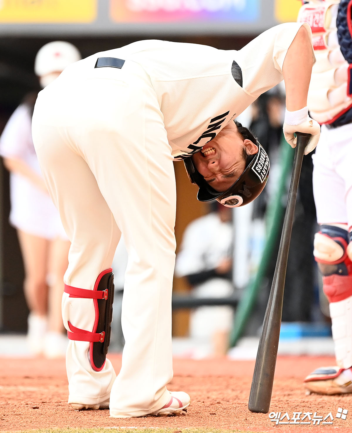 (엑스포츠뉴스 인천, 김한준 기자) 28일 오후 인천 SSG랜더스필드에서 열린 ’2022 신한은행 SOL KBO리그’ 롯데 자이언츠와 SSG 랜더스의 경기, 4회말 SSG 최정이 사구에 맞은 후 고통스러워하고 있다.