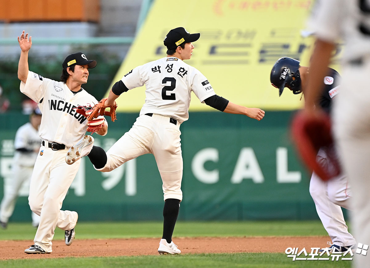 (엑스포츠뉴스 인천, 김한준 기자) 28일 오후 인천 SSG랜더스필드에서 열린 ’2022 신한은행 SOL KBO리그’ 롯데 자이언츠와 SSG 랜더스의 경기, 6회초 1사 1루 SSG 박성한이 롯데 황성빈의 내야땅볼때 한동희를 포스아웃 시킨 후 1루로 송구하고 있다.
