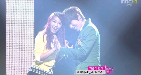 공개된 사진은 지난 16일 방송된 MBC '쇼!음악중심'에서 케이윌의 '가슴이 뛴다'의 깜짝 퍼포먼스를 선보인 후 찍은 사진으로, 앞서 보라는 케이윌과의 무대에서 박치기 퍼포먼스와 하트 세리머니로 화제가 된 바 있다.