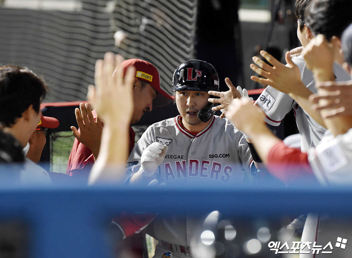 (엑스포츠뉴스 잠실, 김한준 기자) 7일 오후 서울 송파구 잠실야구장에서 열린 '2022 신한은행 SOL KBO리그’ SSG 랜더스와 LG 트윈스의 경기, 9회초 1사 SSG 최정이 솔로 홈런을 날린 후 더그아웃에서 축하를 받고 있다.
