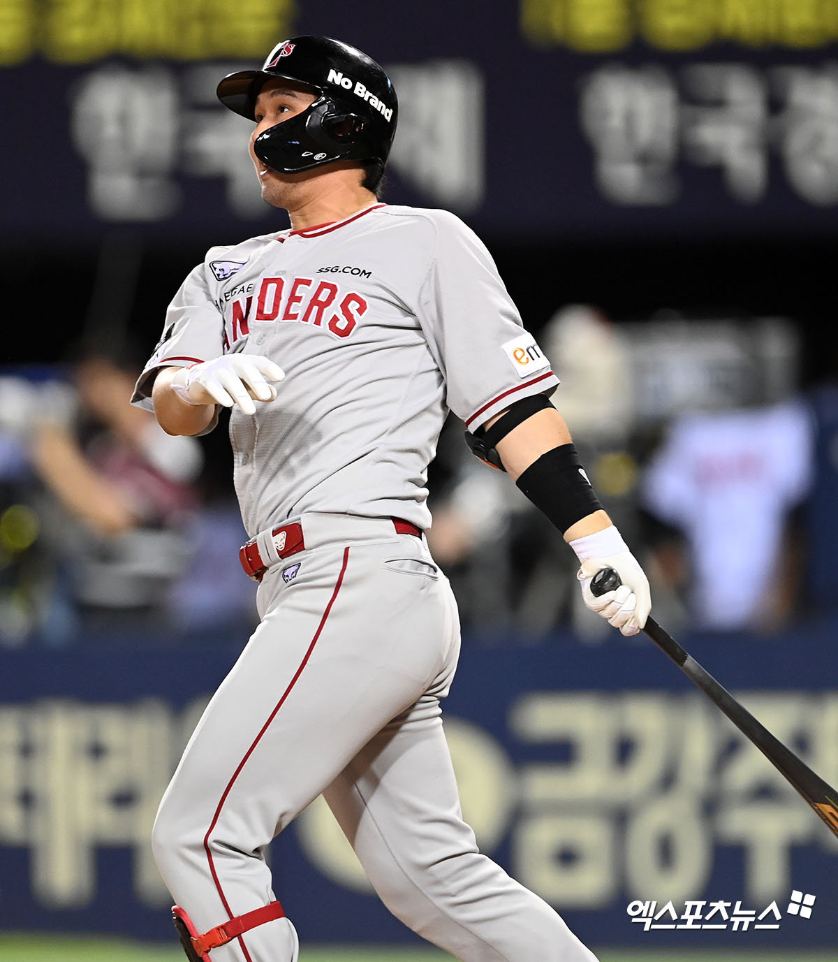 (엑스포츠뉴스 잠실, 김한준 기자) 7일 오후 서울 송파구 잠실야구장에서 열린 '2022 신한은행 SOL KBO리그’ SSG 랜더스와 LG 트윈스의 경기, 9회초 1사 SSG 최정이 솔로 홈런을 날리고 있다.