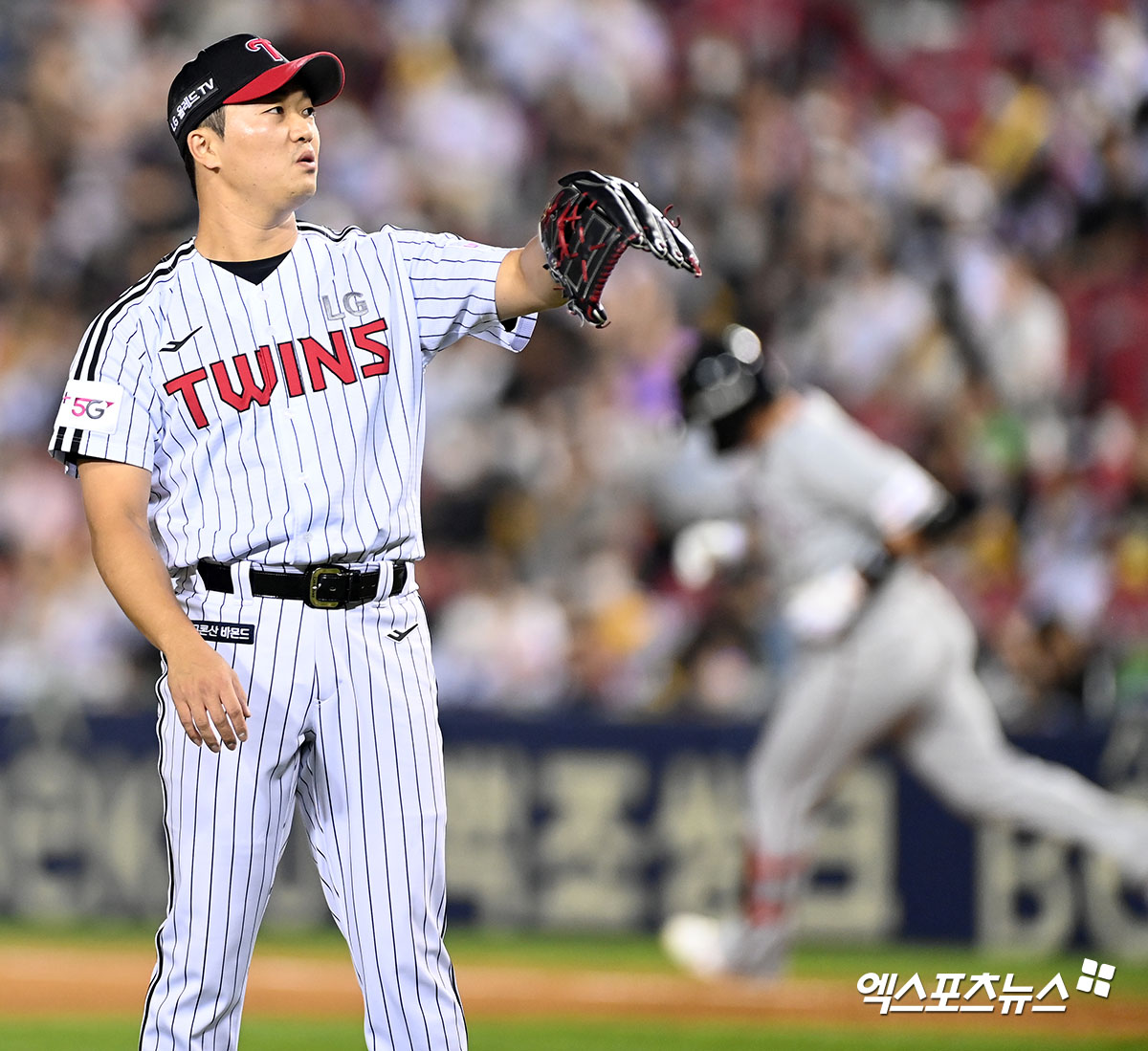 (엑스포츠뉴스 잠실, 김한준 기자) 7일 오후 서울 송파구 잠실야구장에서 열린 '2022 신한은행 SOL KBO리그’ SSG 랜더스와 LG 트윈스의 경기, 9회초 1사 LG 고우석이 SSG 최정에게 솔로 홈런을 허용한 후 아쉬워하고 있다.