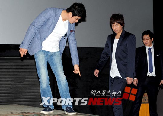 [엑스포츠뉴스 = 권태완 기자] 25일 오후 서울 자양동 롯데시네마 건대점에서 열린 영화 '체포왕' 언론시사회에서 박중훈이 입장하다 계단에서 발이 걸려 넘어질 뻔 하자 이선균에게 조심하라며 제스쳐를 취하고 있다.