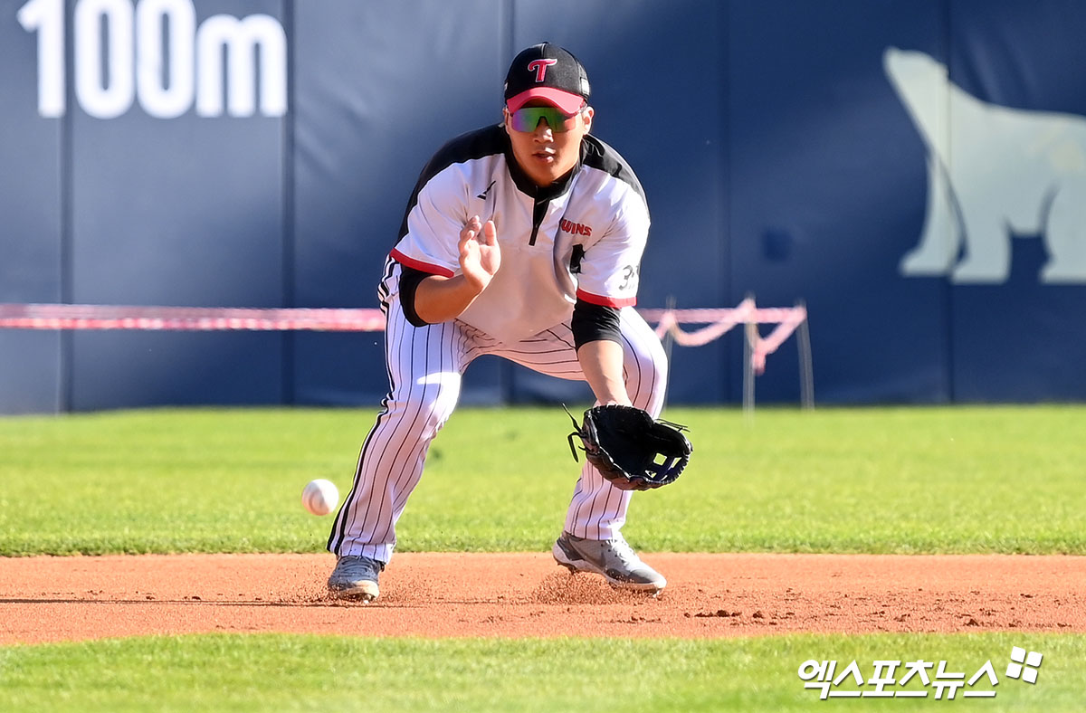 (엑스포츠뉴스 잠실, 김한준 기자) 25일 오후 서울 송파구 잠실야구장에서 열리는 ’2022 신한은행 SOL KBO 포스트시즌’ 키움 히어로즈와 LG 트윈스의 플레이오프 2차전 경기, LG 문보경이 수비 훈련에 임하고 있다.