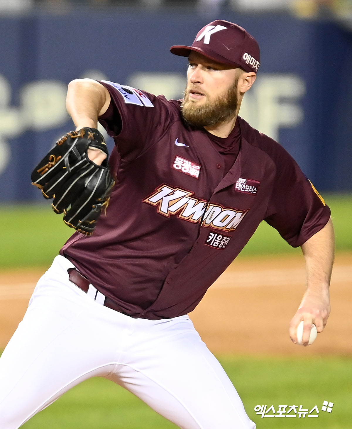 (엑스포츠뉴스 잠실, 김한준 기자) 25일 오후 서울 송파구 잠실야구장에서 열린 ’2022 신한은행 SOL KBO 포스트시즌’ 키움 히어로즈와 LG 트윈스의 플레이오프 2차전 경기, 1회말 키움 선발투수 요키시가 공을 힘차게 던지고 있다.