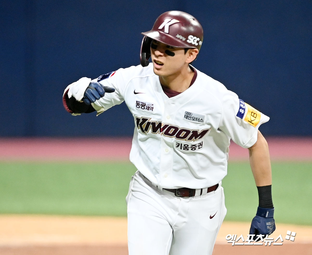 (엑스포츠뉴스 고척, 김한준 기자) 27일 오후 서울 구로구 고척스카이돔에서 열린 ’2022 신한은행 SOL KBO 포스트시즌’ LG 트윈스와 키움 히어로즈의 플레이오프 3차전 경기, 7회말 2사 키움 이정후가 솔로 홈런을 날린 후 기뻐하고 있다.