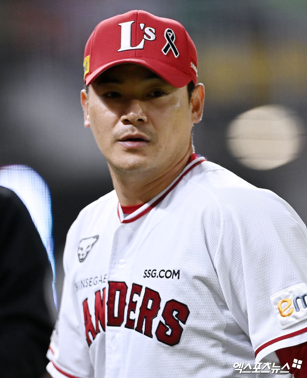(엑스포츠뉴스 인천, 김한준 기자) 1일 오후 인천SSG랜더스필드에서 열린 '2022 신한은행 SOL KBO리그 포스트시즌' 한국시리즈 1차전 키움 히어로즈와 SSG 랜더스 경기, 8회초 수비를 마친 SSG 노경은이 더그아웃으로 향하고 있다.
