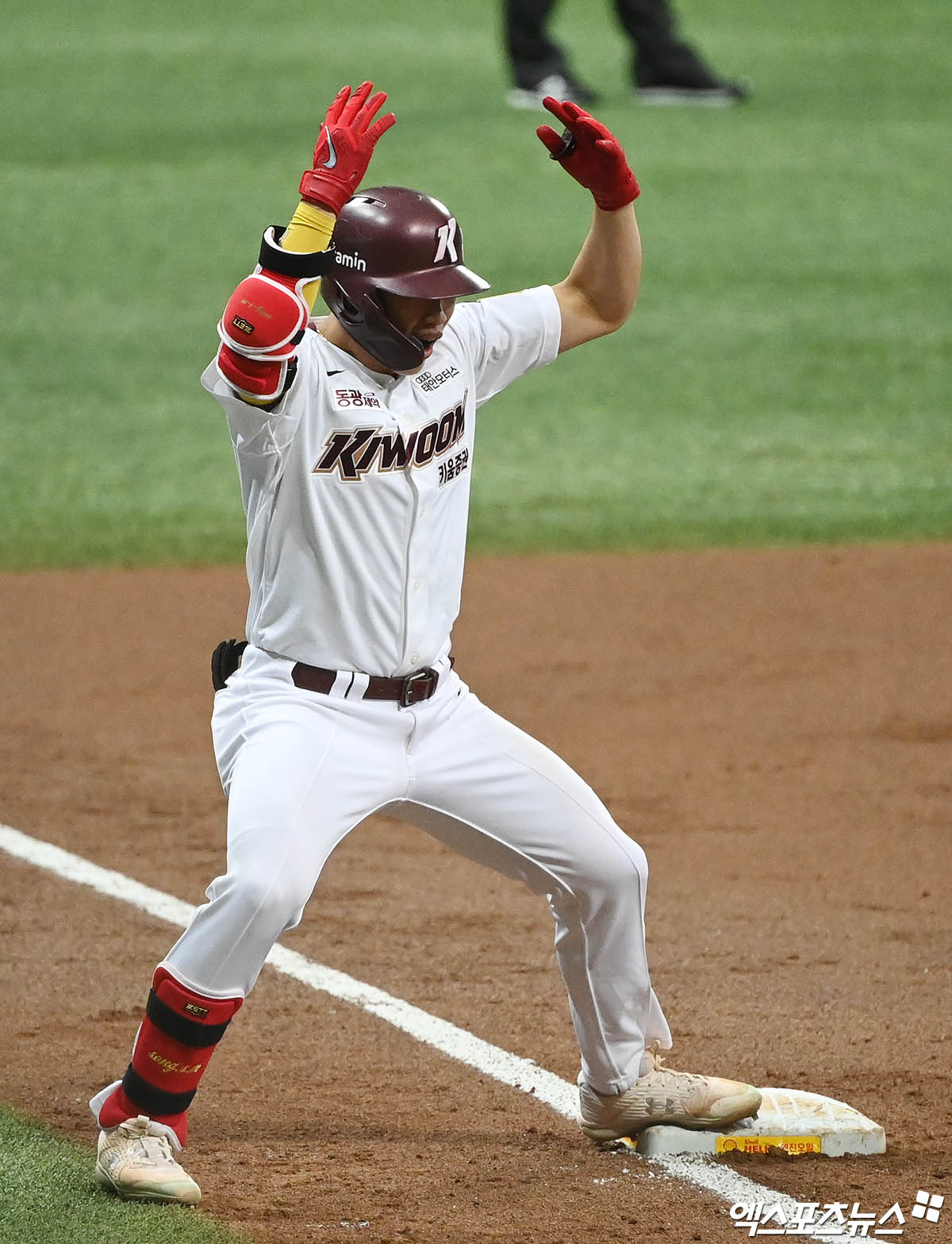 (엑스포츠뉴스 고척, 박지영 기자) 5일 오후 서울 구로구 고척스카이돔에서 열린 '2022 신한은행 SOL KBO리그 포스트시즌' 한국시리즈 4차전 SSG 랜더스와 키움 히어로즈의 경기, 3회말 1사 1,2루 키움 송성문이 2루타를 때려낸 뒤 SSG 실책을 틈타 3루까지 진루한 뒤 세리머니를 하고 있다.