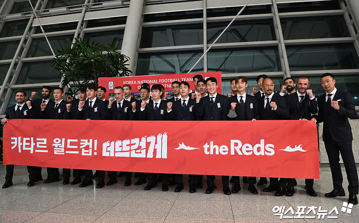 (엑스포츠뉴스 인천공항, 김한준 기자) 2022 카타르 월드컵에 참가하는 대한민국 축구대표팀이 14일 오전 인천국제공항을 통해 카타르로 출국한다. 대한민국 축구대표팀이 출국 전 기념촬영을 갖고 있다.