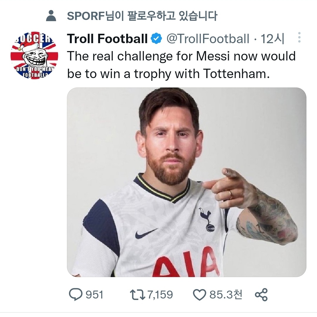 '트롤 풋볼'은 "메시의 진정한 도전은 토트넘과 함께 트로피 따내기가 될 것"이라고 밝혔고, 이 트윗에 무려 86만명이 공감을 표시하는 중이다.