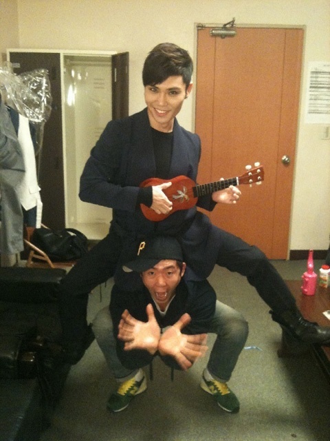 사진 속 김범수는 과장된 화장을 하고 기타를 든 채 동료를 깔고 앉아 있어 코믹하면서도 사악한 느낌까지 든다.