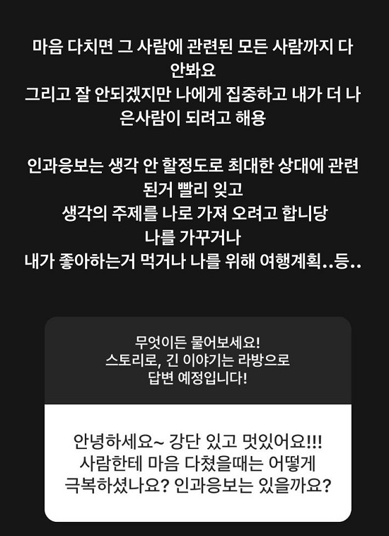 11기 영숙은 "나솔 나갈 시간에 옆에 있는 그분들에게 더 사랑을 쏟는 것도 방법일듯"이라고 덧붙이며 자신은 후회 중임을 간접적으로 드러냈다.