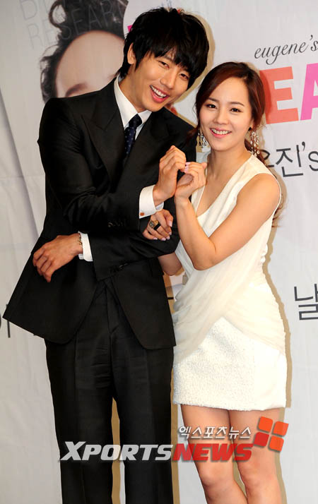 [엑스포츠뉴스 = 권태완 기자] 23일 오후 서울 한강잠원지구 카페 오엔에서 열린 기태영-유진 결혼 기자회견에서 기태영과 유진이 함께 포즈를 취했다.