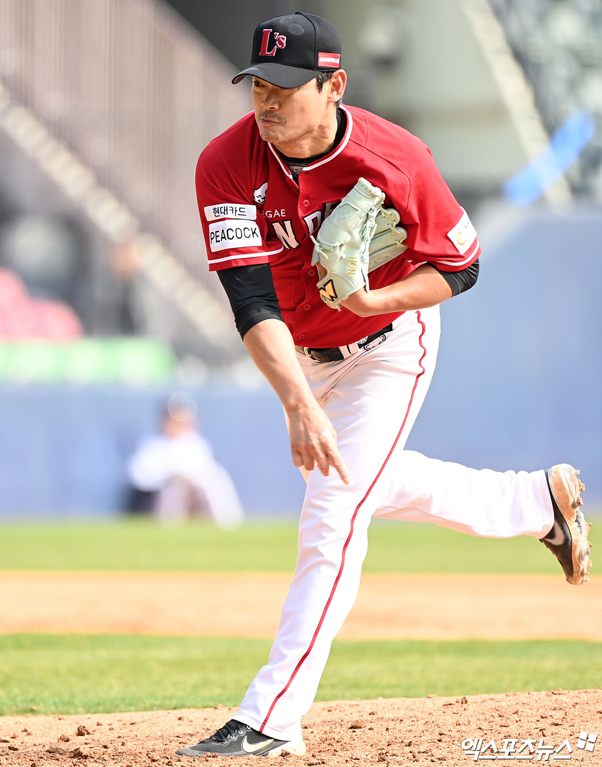 (엑스포츠뉴스 잠실, 김한준 기자) 28일 오후 서울 송파구 잠실야구장에서 열린 ’2023 신한은행 SOL KBO리그’ SSG 랜더스와 LG 트윈스의 시범경기, 9회말 SSG 노경은이 공을 힘차게 던지고 있다.