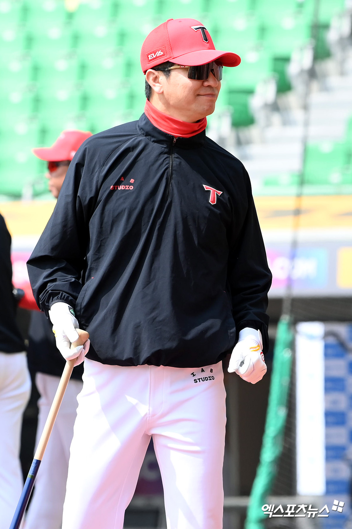 (엑스포츠뉴스 인천, 고아라 기자) 1일 오후 인천SSG랜더스필드에서 열리는 '2023 신한은행 SOL KBO리그' KIA 타이거즈와 SSG 랜더스의 경기에 앞서 KIA 김종국 감독이 훈련을 지켜보고 있다.