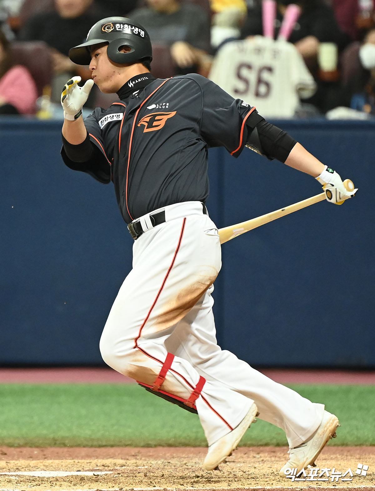 (엑스포츠뉴스 고척, 김한준 기자) 1일 오후 서울 구로구 고척스카이돔에서 열린 ’2023 신한은행 SOL KBO리그’ 한화 이글스와 키움 히어로즈의 개막전 경기, 6회초 1사 한화 노시환이 좌전안타를 날리고 있다.