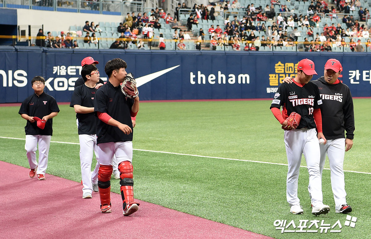 (엑스포츠뉴스 고척, 김한준 기자) 15일 오후 서울 구로구 고척스카이돔에서 열린 ’2023 신한은행 SOL KBO리그’ KIA 타이거즈와 키움 히어로즈의 경기, 경기 전 KIA 선발투수 윤영철이 웜업을 마친 후 더그아웃으로 향하고 있다.