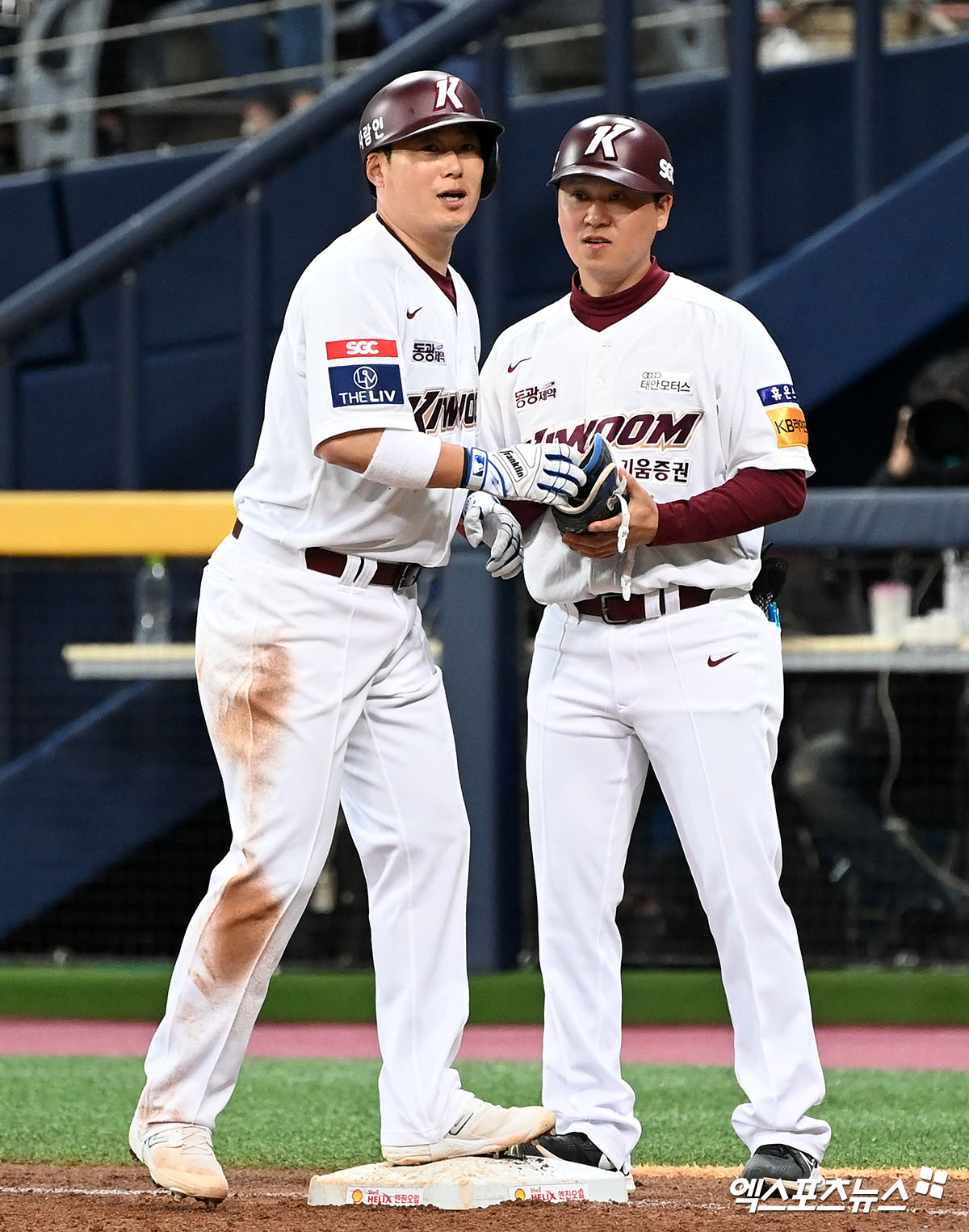 (엑스포츠뉴스 고척, 김한준 기자) 27일 오후 서울 구로구 고척스카이돔에서 열린 ’2023 신한은행 SOL KBO리그’ KT 위즈와 키움 히어로즈의 경기, 2회말 키움 이원석이 좌전안타를 날린 후 귀루하고 있다.