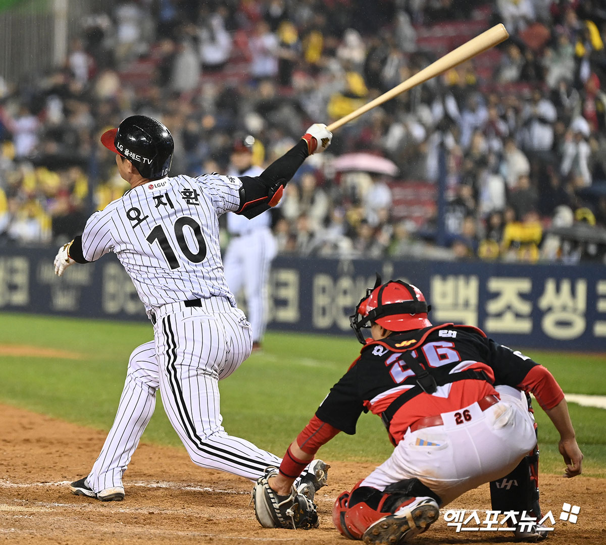 (엑스포츠뉴스 잠실, 김한준 기자) 28일 오후 서울 송파구 잠실야구장에서 열린 ’2023 신한은행 SOL KBO리그’ KIA 타이거즈와 LG 트윈스의 경기, 9회말 2사 1루 LG 오지환이 헛스윙 삼진을 당하고 있다.