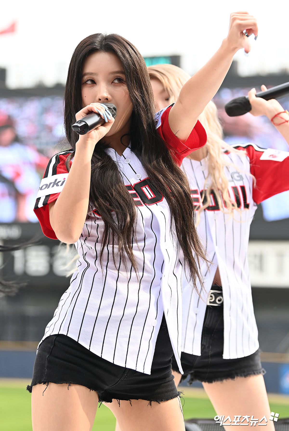 (엑스포츠뉴스 잠실, 김한준 기자) 30일 오후 서울 송파구 잠실야구장에서 열린 ’2023 신한은행 SOL KBO리그’ KIA 타이거즈와 LG 트윈스의 경기, (여자)아이들 소연이 멋진 공연을 선보이고 있다.