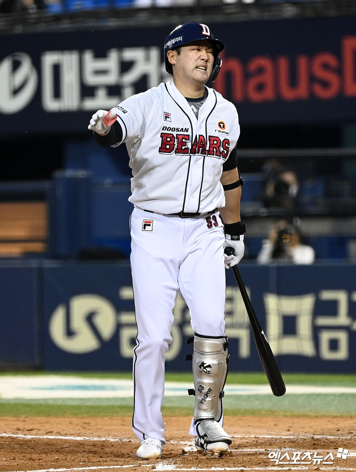 (엑스포츠뉴스 잠실, 김한준 기자) 2일 오후 서울 송파구 잠실야구장에서 열린 ’2023 신한은행 SOL KBO리그’ 한화 이글스와 두산 베어스의 경기, 4회말 무사 2루 두산 양석환이 헛스윙 삼진을 당하고 있다.
