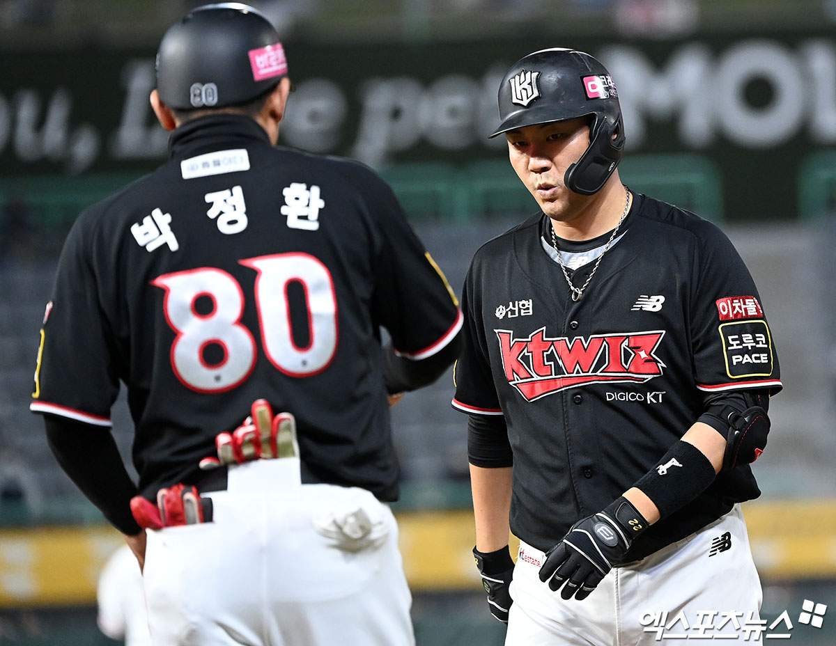 (엑스포츠뉴스 인천, 김한준 기자) 3일 오후 인천SSG랜더스필드에서 열린 ’2023 신한은행 SOL KBO리그’ KT 위즈와 SSG 랜더스의 경기, 5회초 2사 KT 장성우가 좌중간 안타를 날린 후 귀루하고 있다.