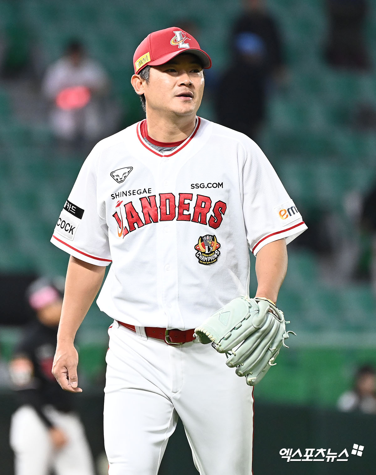 (엑스포츠뉴스 인천, 김한준 기자) 3일 오후 인천SSG랜더스필드에서 열린 ’2023 신한은행 SOL KBO리그’ KT 위즈와 SSG 랜더스의 경기, 8회초 수비를 마친 SSG 노경은이 더그아웃으로 향하고 있다.