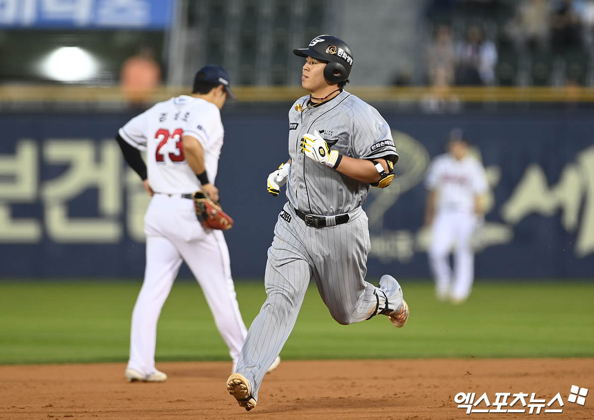 (엑스포츠뉴스 잠실, 박지영 기자) 4일 오후 서울 송파구 잠실야구장에서 열린 '2023 신한은행 SOL KBO리그' 한화 이글스와 두산 베어스의 경기, 4회초 1사 한화 노시환이 두산 선발투수 딜런 상대로 선제 솔로 홈런을 때려낸 뒤 베이스를 돌고 있다.