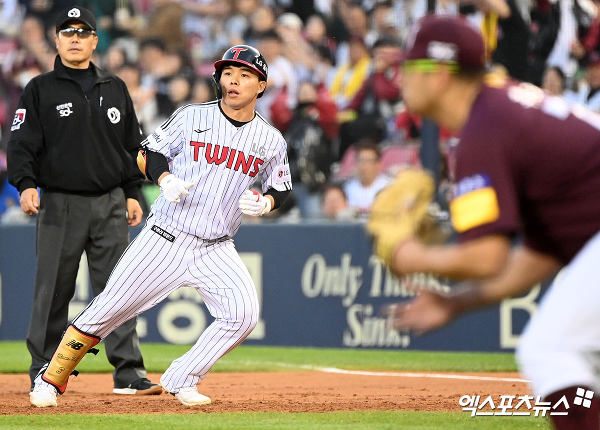 (엑스포츠뉴스 잠실, 김한준 기자) 9일 오후 서울 송파구 잠실야구장에서 열린 '2023 신한은행 SOL KBO리그' 키움 히어로즈와 LG 트윈스의 경기, 2회말 2사 1,2루 LG 문성주가 1타점 적시타를 날린 후 귀루하고 있다.