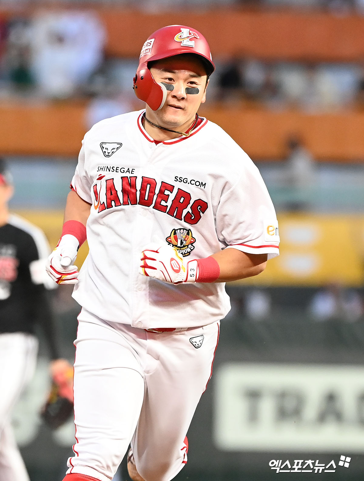 (엑스포츠뉴스 인천, 김한준 기자) 24일 오후 인천SSG랜더스필드에서 열린 '2023 신한은행 SOL KBO리그' LG 트윈스와 SSG 랜더스의 경기, 4회말 SSG 최주환이 솔로 홈런을 날린 후 그라운드를 돌고 있다.