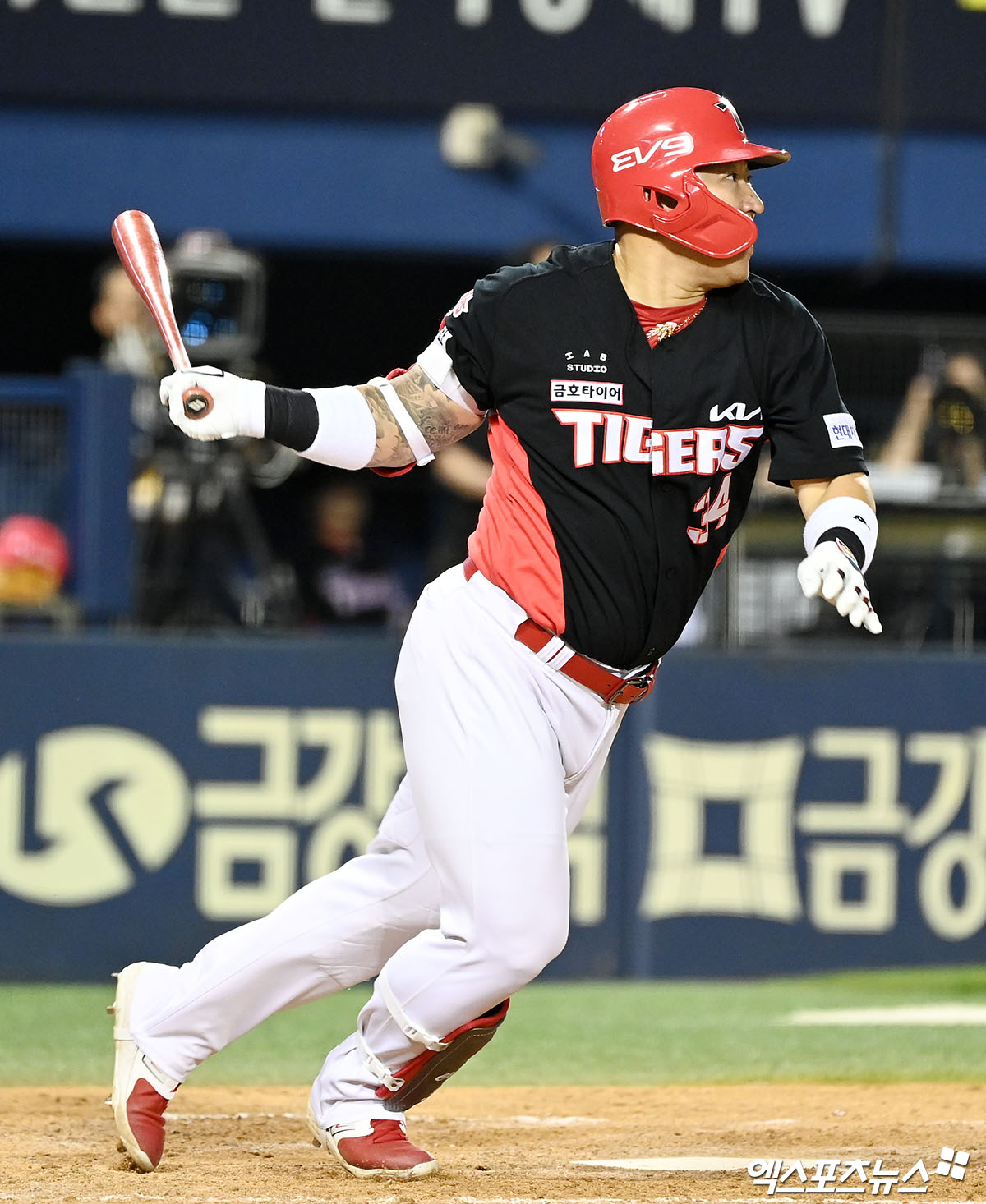 (엑스포츠뉴스 잠실, 김한준 기자) 9일 오후 서울 송파구 잠실야구장에서 열린 '2023 신한은행 SOL KBO리그' KIA 타이거즈와 두산 베어스의 경기, 5회초 2사 1,2루 KIA 최형우가 1타점 적시타를 날리고 있다.
