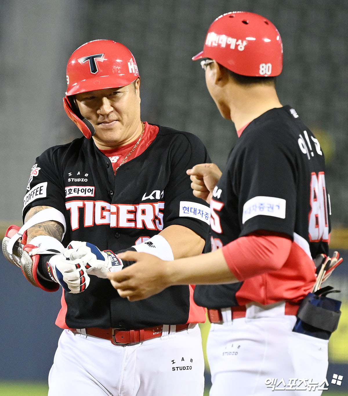 (엑스포츠뉴스 잠실, 김한준 기자) 9일 오후 서울 송파구 잠실야구장에서 열린 '2023 신한은행 SOL KBO리그' KIA 타이거즈와 두산 베어스의 경기, 7회초 무사 2루 KIA 최형우가 좌전안타를 날린 후 귀루하고 있다.