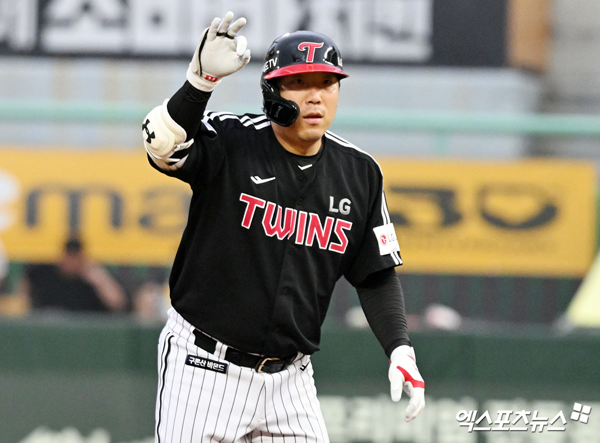 (엑스포츠뉴스 인천, 김한준 기자) 28일 오후 인천SSG랜더스필드에서 열린 '2023 신한은행 SOL KBO리그' LG 트윈스와 SSG 랜더스의 경기, 1회말 1사 3루 LG 김현수가 1타점 2루타를 날린 후 기뻐하고 있다.