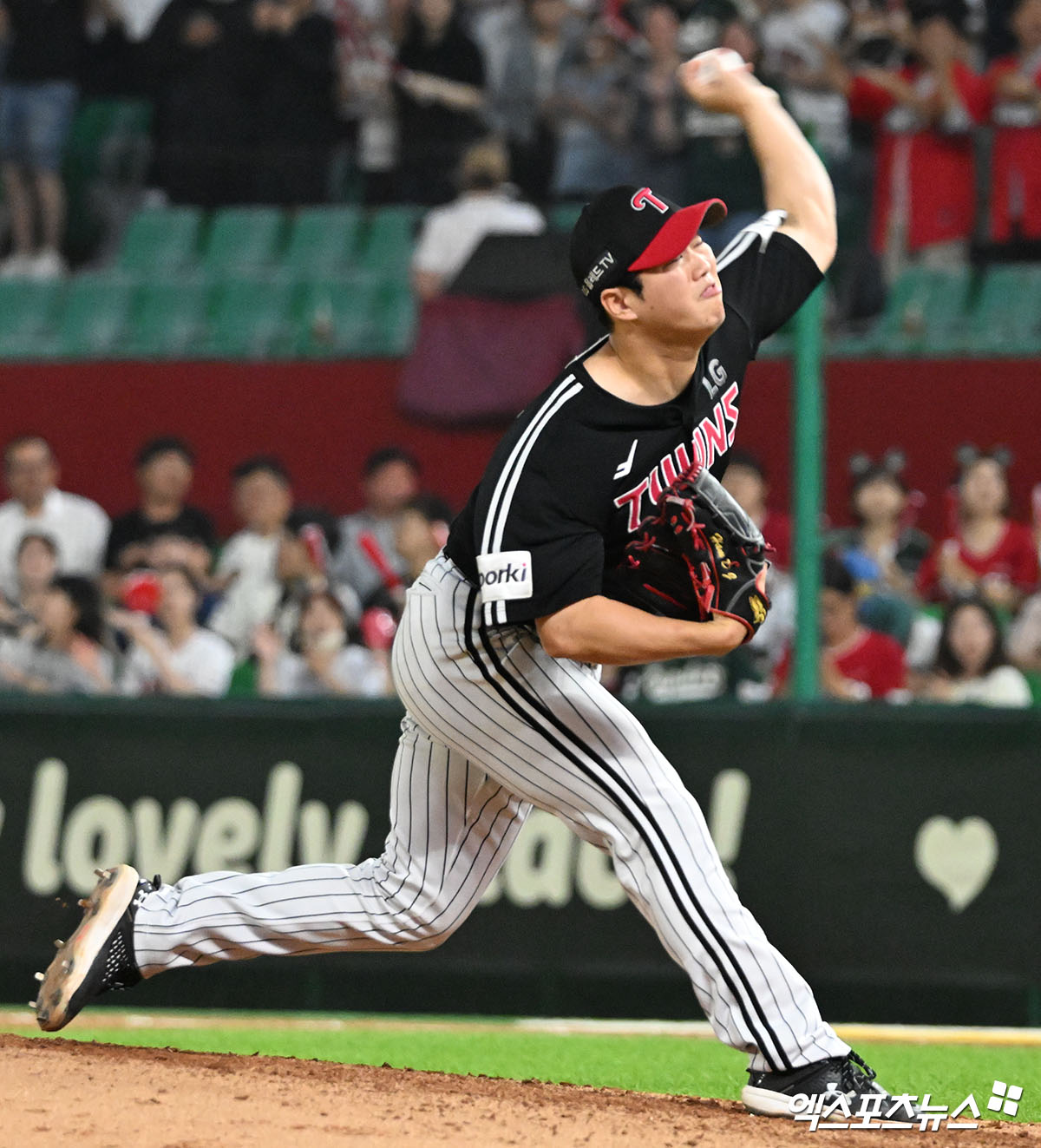 (엑스포츠뉴스 인천, 김한준 기자) 28일 오후 인천SSG랜더스필드에서 열린 '2023 신한은행 SOL KBO리그' LG 트윈스와 SSG 랜더스의 경기, 5회말 LG 함덕주가 공을 힘차게 던지고 있다.