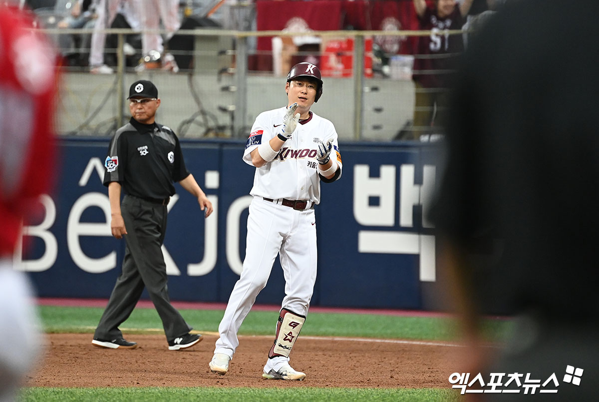 (엑스포츠뉴스 고척, 김한준 기자) 2일 오후 서울 구로구 고척스카이돔에서 열린 '2023 신한은행 SOL KBO리그' SSG 랜더스와 키움 히어로즈의 경기, 5회말 무사 만루 키움 이원석이 2타점 적시타를 날린 후 박수를 치고 있다.