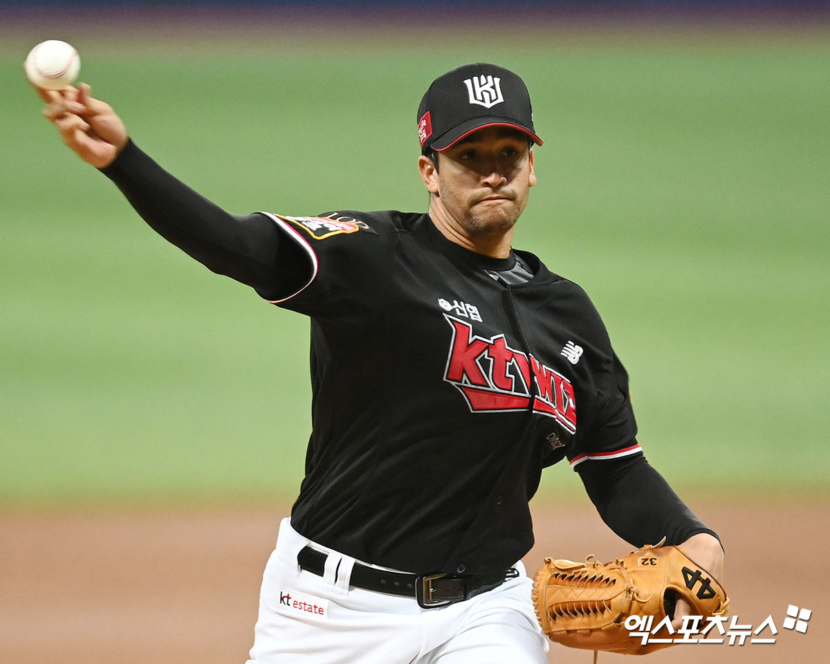 (엑스포츠뉴스 고척, 김한준 기자) 12일 오후 서울 구로구 고척스카이돔에서 열린 '2023 신한은행 SOL KBO리그' KT 위즈와 키움 히어로즈의 경기, 1회말 KT 선발투수 쿠에바스가 공을 힘차게 던지고 있다.