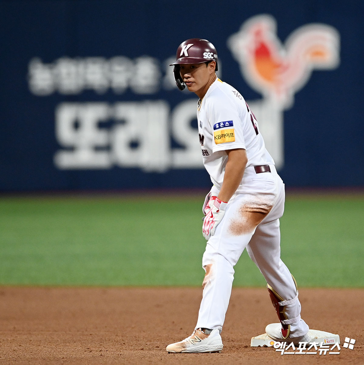 (엑스포츠뉴스 고척, 김한준 기자) 12일 오후 서울 구로구 고척스카이돔에서 열린 '2023 신한은행 SOL KBO리그' KT 위즈와 키움 히어로즈의 경기, 8회말 2사 키움 송성문이 우중간 안타를 날린 후 2루까지 진루하며 타임을 요청하고 있다.