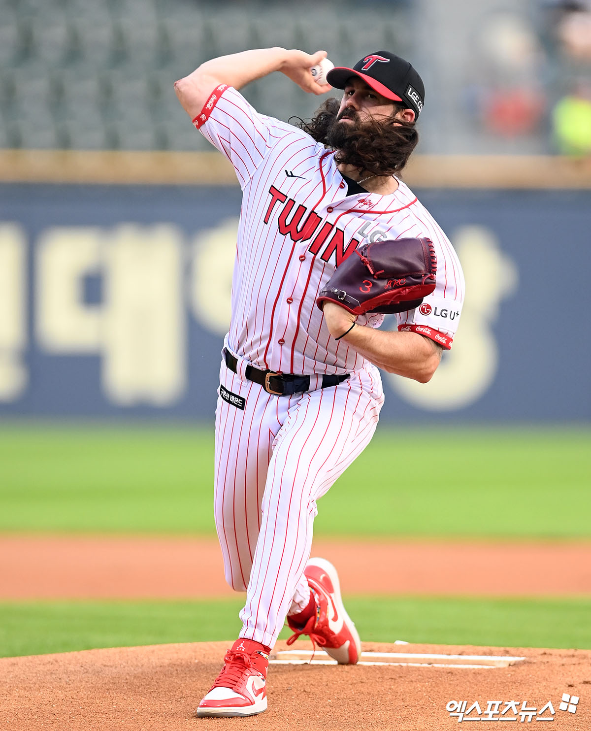 (엑스포츠뉴스 잠실, 김한준 기자) 21일 오후 서울 송파구 잠실야구장에서 열린 '2023 신한은행 SOL KBO리그' SSG 랜더스와 LG 트윈스의 경기, 1회초 LG 선발투수 켈리가 공을 힘차게 던지고 있다.