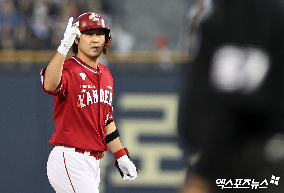 (엑스포츠뉴스 잠실, 김한준 기자) 21일 오후 서울 송파구 잠실야구장에서 열린 '2023 신한은행 SOL KBO리그' SSG 랜더스와 LG 트윈스의 경기, 5회초 2사 2루 SSG 최정이 1타점 2루타를 날린 후 기뻐하고 있다.