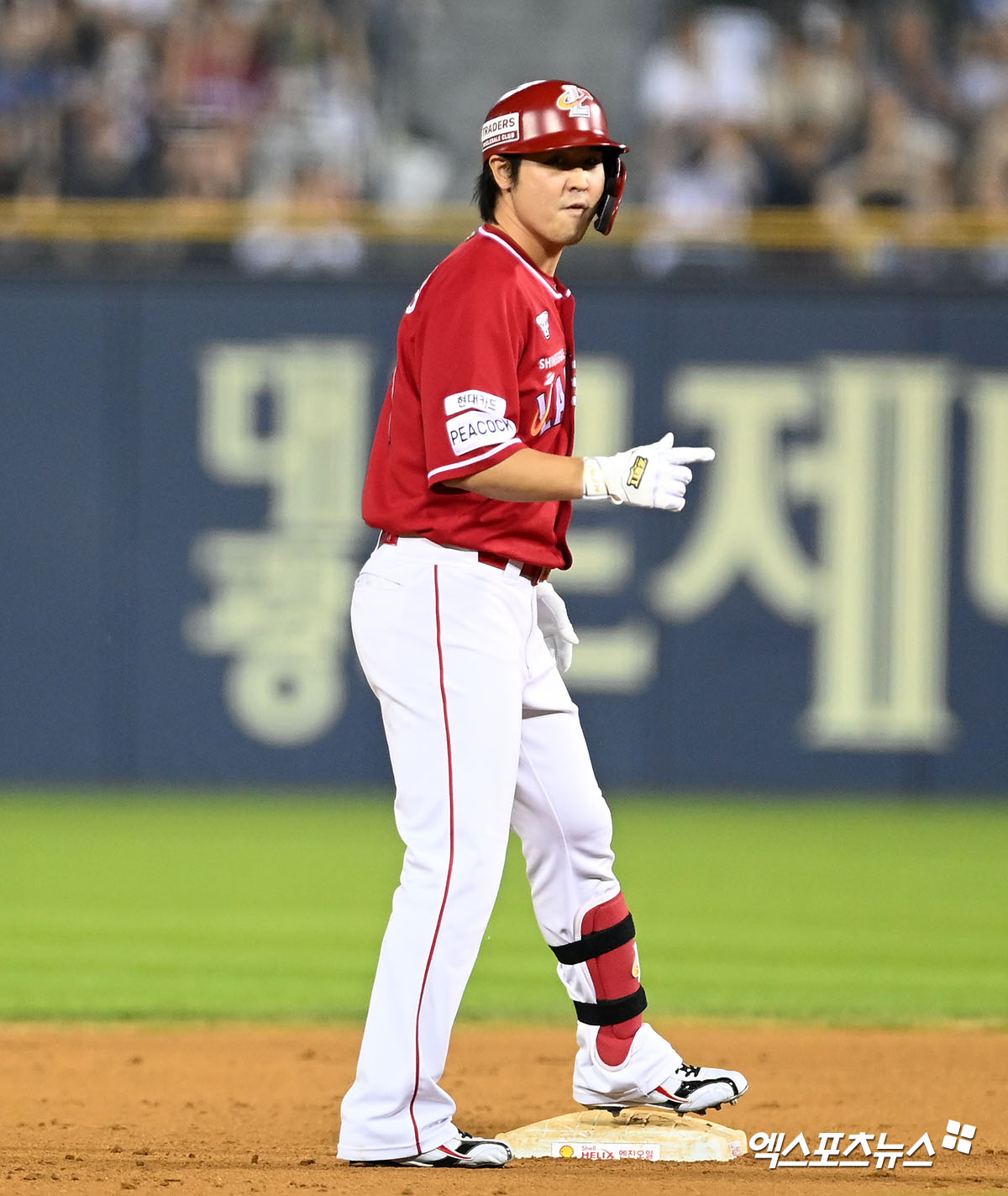 (엑스포츠뉴스 잠실, 김한준 기자) 21일 오후 서울 송파구 잠실야구장에서 열린 '2023 신한은행 SOL KBO리그' SSG 랜더스와 LG 트윈스의 경기, 7회초 1사 1루 SSG 최정이 1타점 2루타를 날린 후 타임을 요청하고 있다.