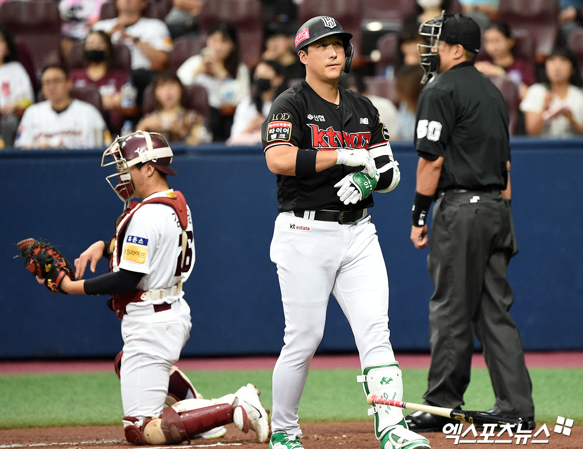(엑스포츠뉴스 고척, 김한준 기자) 3일 오후 서울 구로구 고척스카이돔에서 열린 '2023 신한은행 SOL KBO리그' KT 위즈와 키움 히어로즈의 경기, 2회초 1사 KT 황재균이 볼넷으로 출루하고 있다.