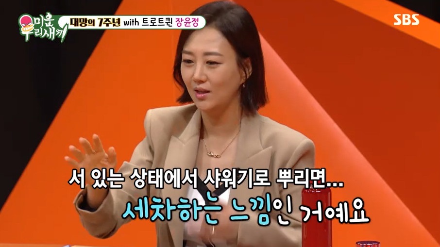 장윤정은 "(도경완이)씻지를 못한다. 여름이라 얼마나 답답하냐. 씻겨달라고 하면 덩치가 크지 않냐. 서 있는데 세차하는 느낌이 든다"고 너스레를 떨었다.