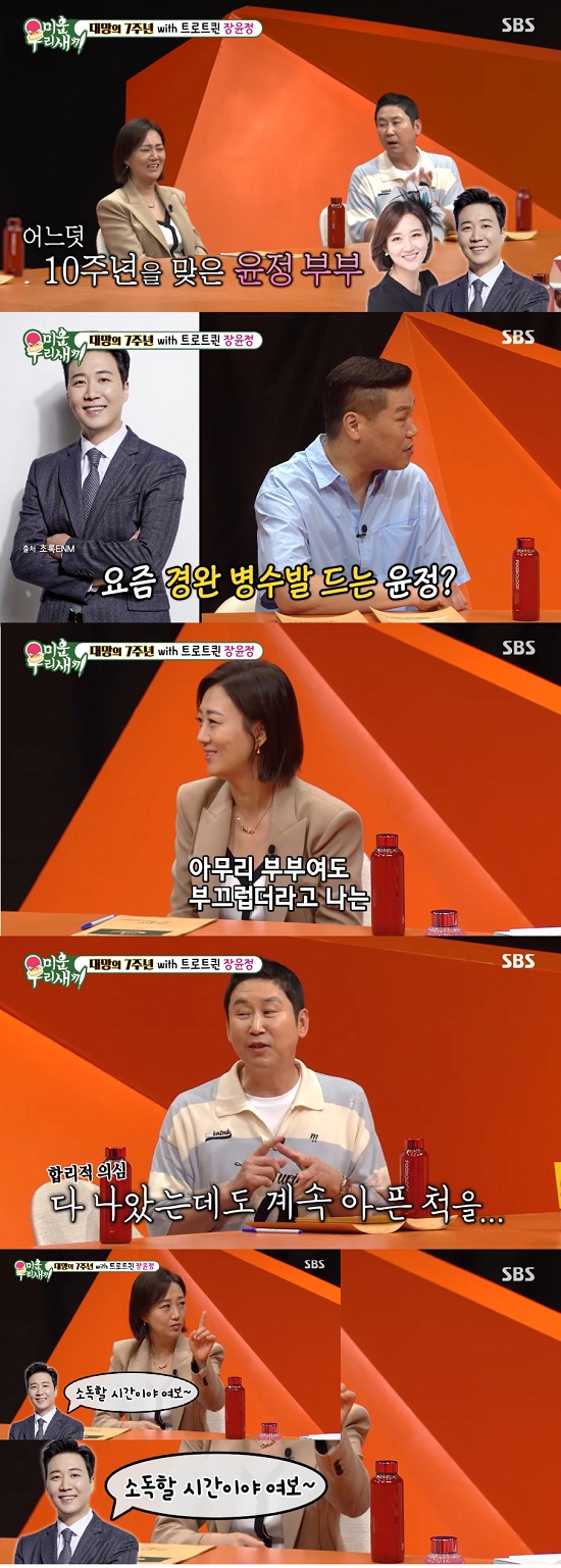 이날 신동엽은 장윤정과 도경완 부부가 결혼 10주년을 맞이했다는 축하를 건넸고, 서장훈은 "장윤정이 도경완의 병수발을 들고 있다더라"고 근황을 언급했다.