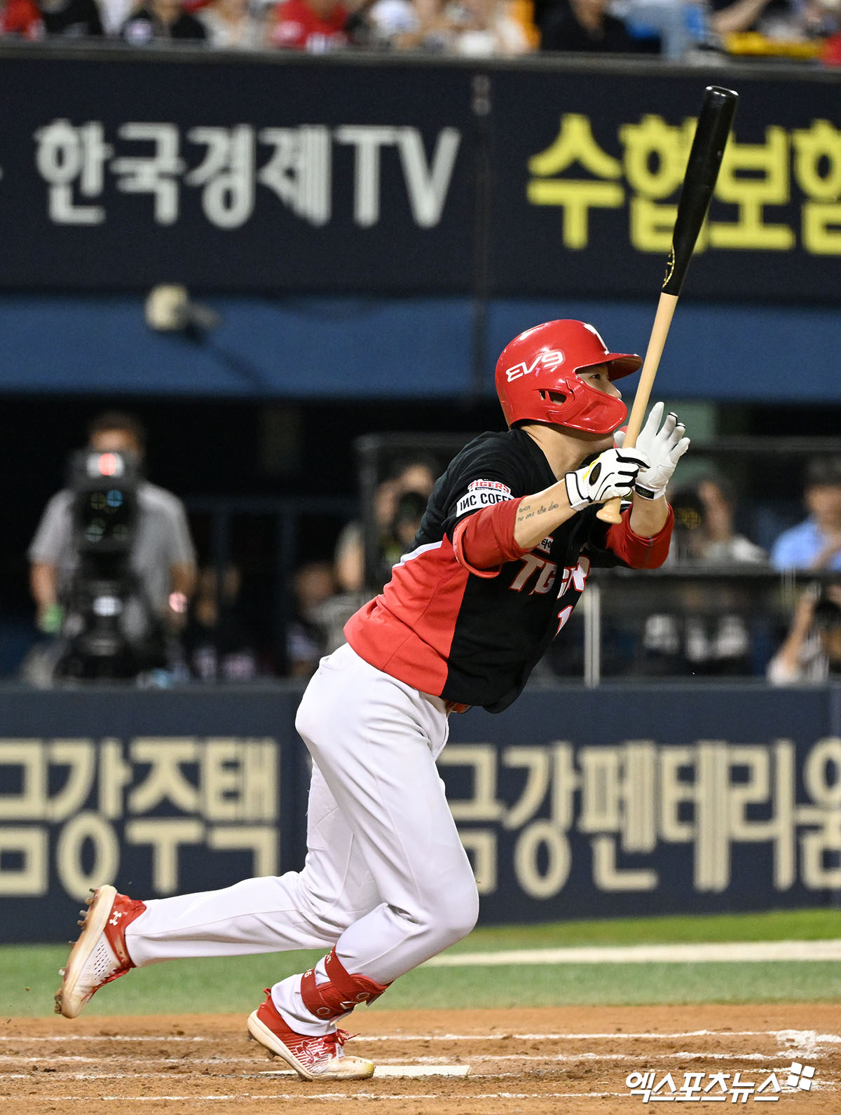 (엑스포츠뉴스 잠실, 김한준 기자) 6일 오후 서울 송파구 잠실야구장에서 열린 '2023 신한은행 SOL KBO리그' KIA 타이거즈와 두산 베어스의 경기, 4회초 무사 1루 KIA 최원준이 우전안타를 날리고 있다.