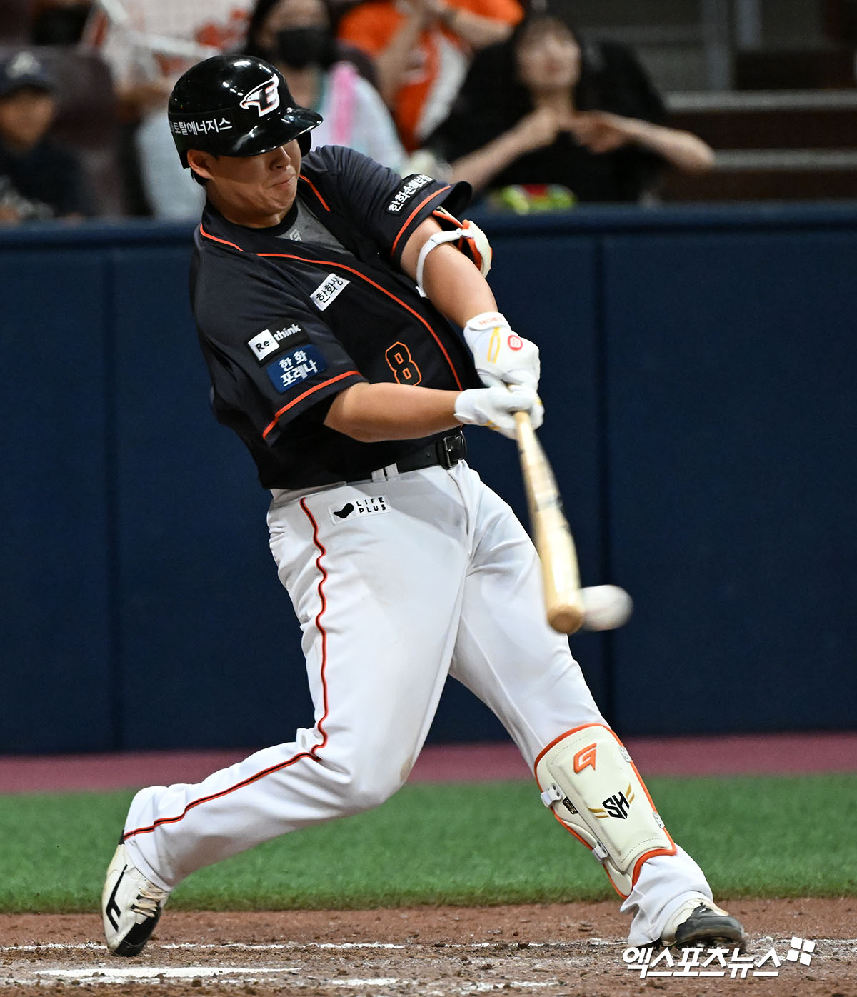 (엑스포츠뉴스 고척, 김한준 기자) 8일 오후 서울 구로구 고척스카이돔에서 열린 '2023 신한은행 SOL KBO리그' 한화 이글스와 키움 히어로즈의 경기, 10회초 1사 한화 노시환이 좌전안타를 날리고 있다.