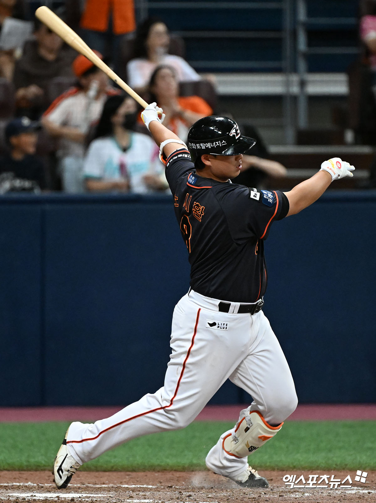 (엑스포츠뉴스 고척, 김한준 기자) 8일 오후 서울 구로구 고척스카이돔에서 열린 '2023 신한은행 SOL KBO리그' 한화 이글스와 키움 히어로즈의 경기, 10회초 한화 노시환이 좌전안타를 날리고 있다.