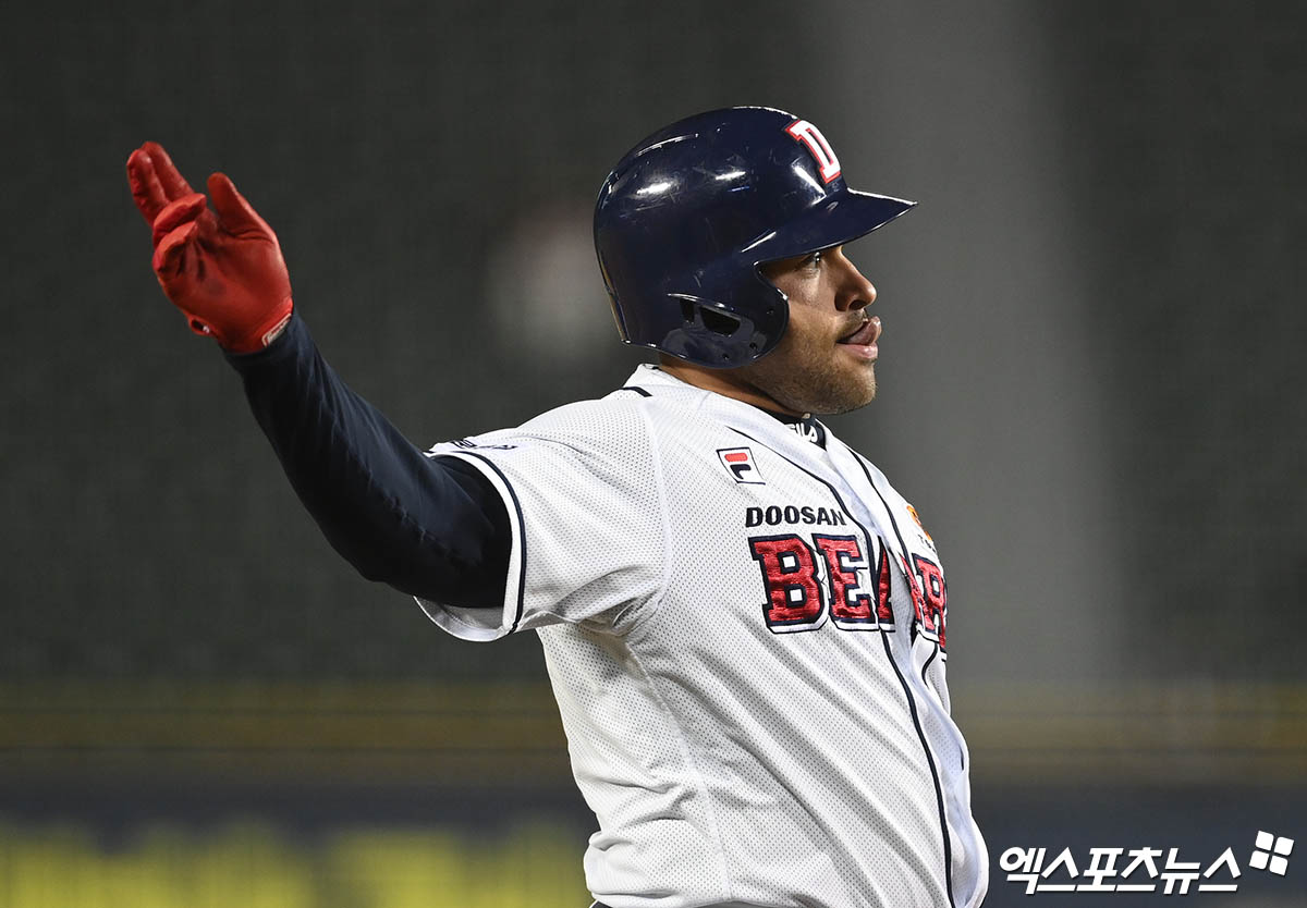 (엑스포츠뉴스 잠실, 박지영 기자) 12일 오후 서울 송파구 잠실야구장에서 열린 '2023 신한은행 SOL KBO리그' NC 다이노스와 두산 베어스의 경기, 4회말 1사 2루 두산 로하스가 1타점 3루타를 때려내고 있다.