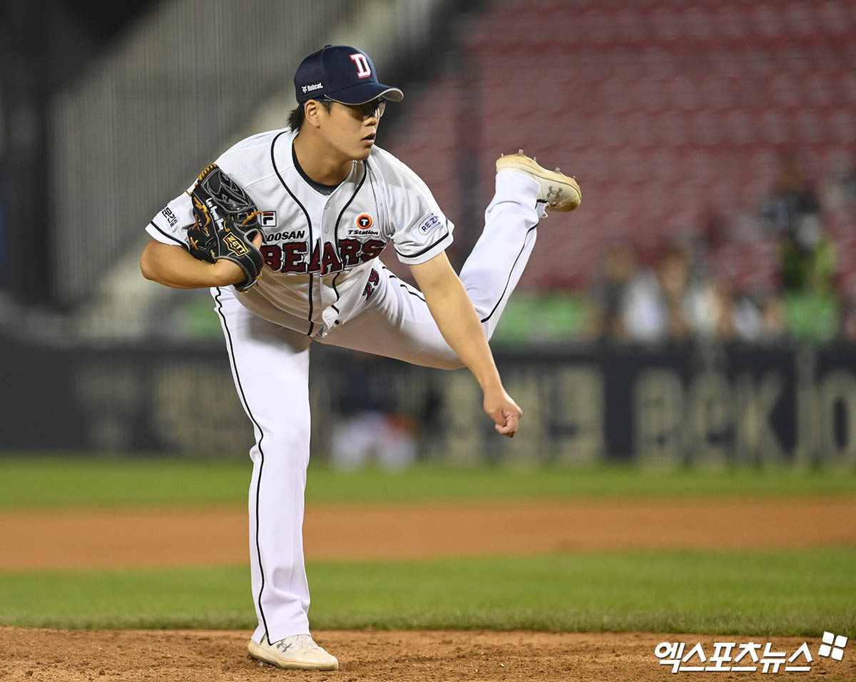 (엑스포츠뉴스 잠실, 박지영 기자) 12일 오후 서울 송파구 잠실야구장에서 열린 '2023 신한은행 SOL KBO리그' NC 다이노스와 두산 베어스의 경기, 6회초 2사 두산 이병헌이 역투하고 있다.
